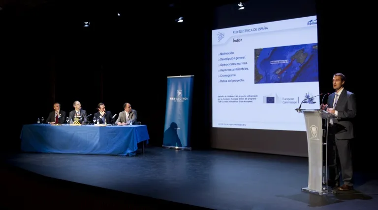El director general de Transporte de Red Eléctrica de España, Carlos Collantes, el presidente del Gobierno Balear, José Ramón Bauzá, y el presidente del Consell Insular de Ibiza, Vicent Serra, han presentado hoy en el Centro Cultural del Pueblo de Jesús el enlace eléctrico submarino Ibiza-Mallorca. El acto comenzó con la bienvenida del alcalde de Santa Eulalia del Río, Vicent Marí y finalizó con la presentación técnica del enlace a cargo del director del proyecto, Juan Prieto.